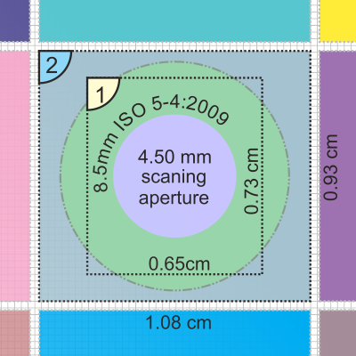 Taipogi ISO 5-4:2009 standartas nustato, kad spausdintuvo kalibracijos testų lentelės langelių dydis turi būti +2mm didesnis nei naudojamo instrumento apertūra (optinės sistemos anga). "...irradiated area of the specimen shall be greater than the sampling aperture, and its boundary shall lie at least 2 mm beyond the boundary of the sampling aperture." Spektrofotometro pozicionavimas Kalibracijos lentelių langeliai yra skenuojami specialia įranga spektrofotometru. Tai profesionalus prietaisas, skirtas išmatuoti švytinčią arba atspindėtą šviesos srauto energiją daugelyje dažnių visame šviesos spektre. Spektrofotometro apertūros pozicionavimas yra labai svarbus faktorius siekiant užtikrinti aukšto lygio spalvų valdymo profilių sukūrimą. Mes naudojame tik kompiuterinio pozicionavimo sistemas išvengiant rankinio pozicionavimo galimai sukeltų netikslumų. |